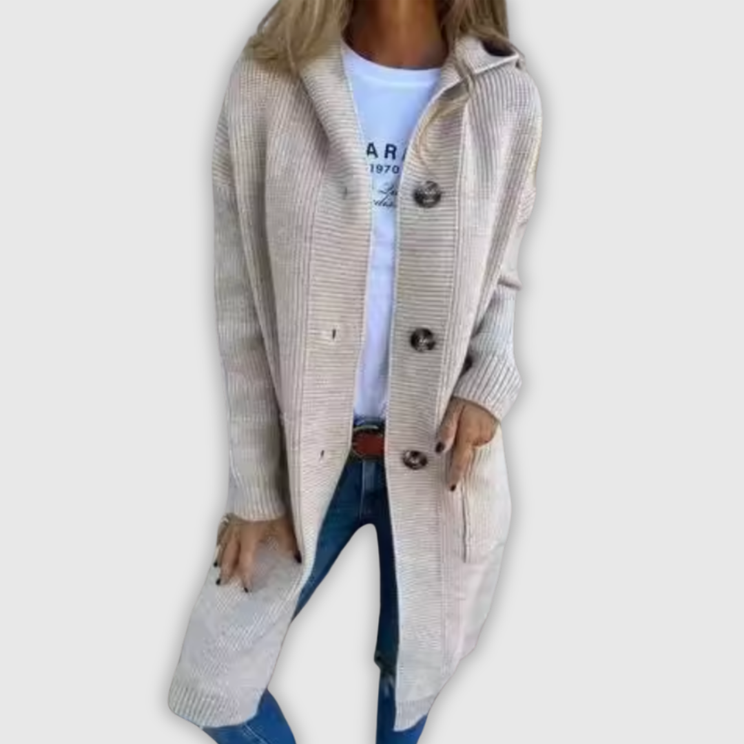 Udoban dugi kardigan u elegantnom i minimalističkom stilu upotpunjuje svaku odjeću i dodaje toplinu i stil.