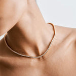 Ta ogrlica donosi suptilan dodir luksuza i elegancije, koji lijepo nadopunjuje različite modne stilove. Jednostavan, ali raskošan dizajn s blistavim kamenjem stvara bezvremenski glamurozan izgled, koji odgovara kako svakodnevnim kombinacijama, tako i večernjim odjevnim kombinacijama. Izrađena od nehrđajućeg čelika, obloženog zlatom 14-karatne čistoće, s širinom od 3 mm i duljinom od 33,5 cm + 6,5 cm produžetka, hvata svjetlost iz svih kutova i dodaje sjajan naglasak svakom izgledu.